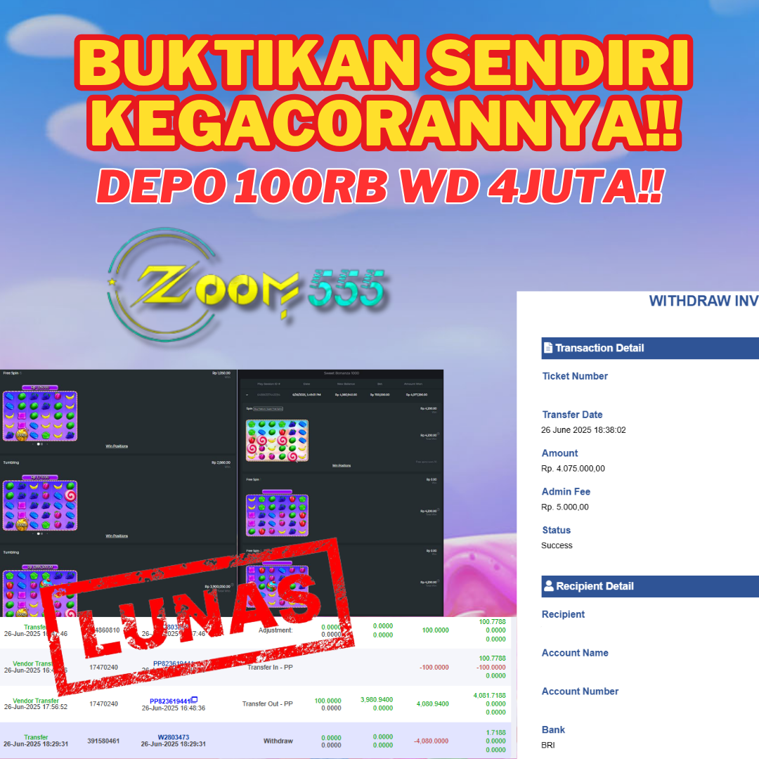 Sedang cari situs slot online yang benar-benar gacor dan bisa kasih kamu cuan setiap hari? Kalau iya, kamu wajib coba ZOOM555! Situs ini sudah terbukti menjadi rumah bagi para pemain yang haus akan kemenangan besar dan sensasi auto jackpot yang nyata. Bukan cuma klaim semata—banyak pemain sudah membuktikan sendiri, dan sekarang giliran kamu!
