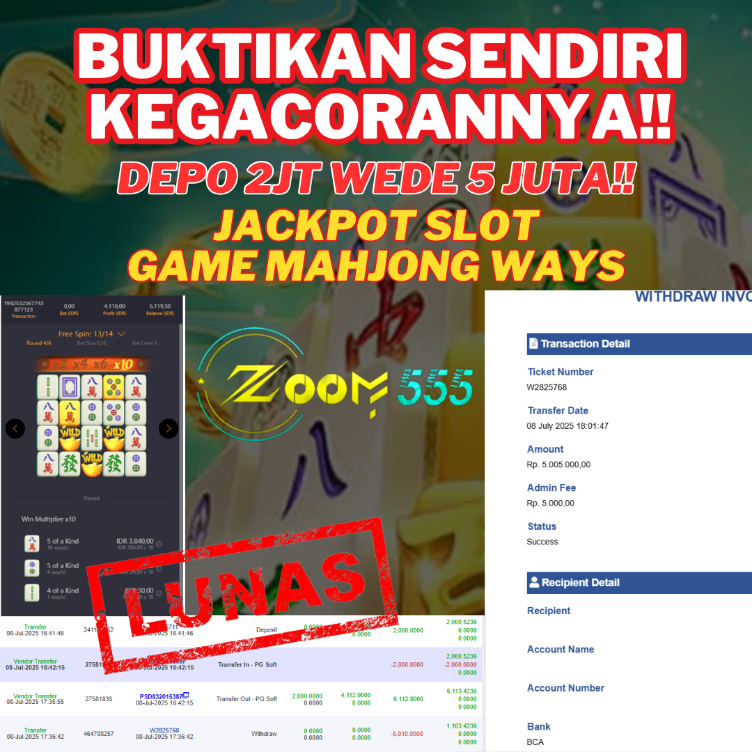 Dengan memanfaatkan promo ini, peluang menang makin terbuka lebar. Kombinasi antara kegacoran Mahjong Ways dan dukungan bonus dari ZOOM555 benar-benar bisa jadi senjata rahasia kamu untuk panen cuan!